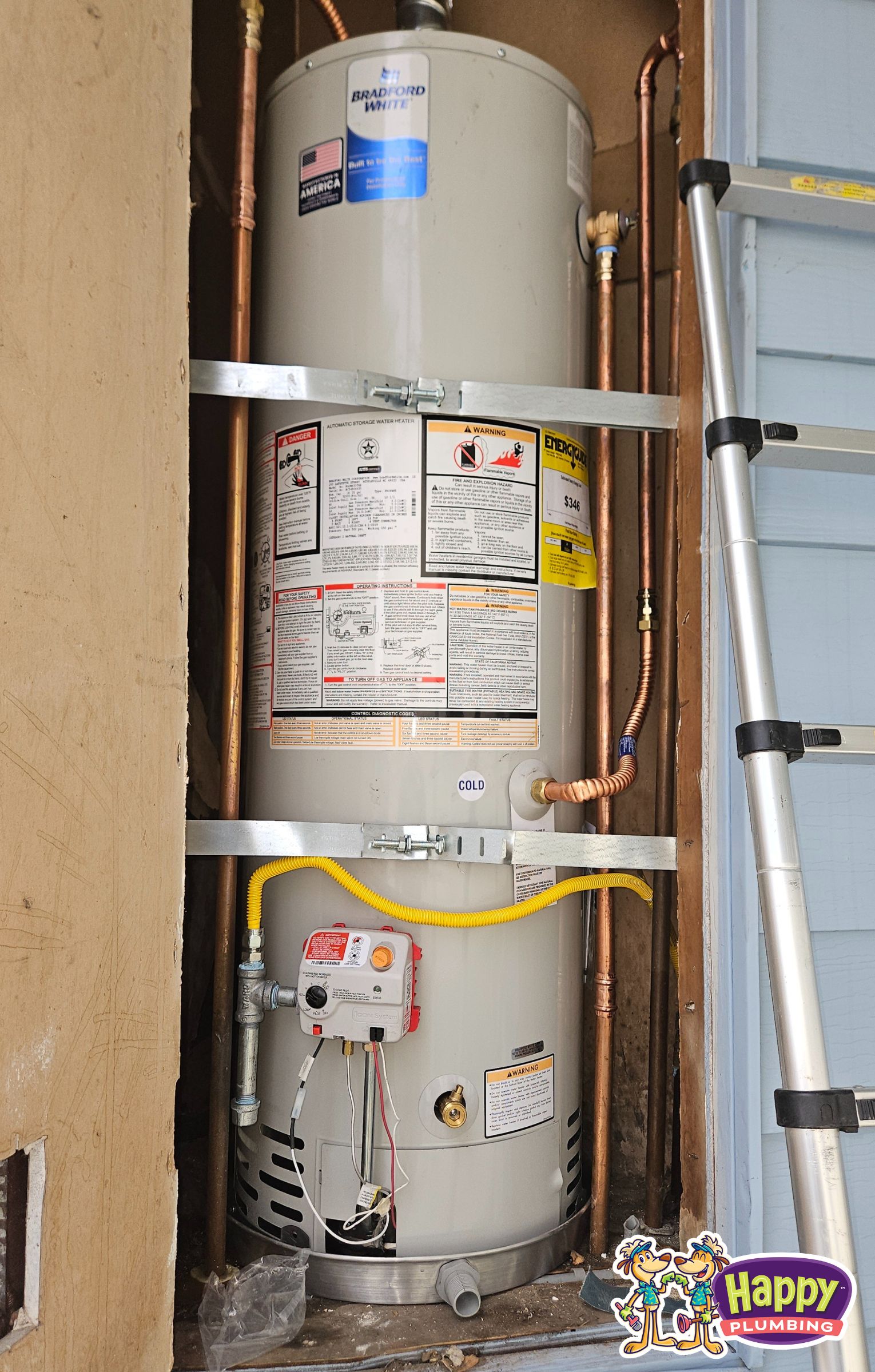 Our team at Happy Plumbing was called to a home in Santee where the customer’s 15-year-old water heater showed signs of wear and corrosion. After assessing the condition and confirming the unit had passed its service life, we recommended a full replacement to prevent future leaks and costly water damage. We installed a new Bradford White 30-gallon water heater, brought the installation up to current plumbing codes, added a drain pan, and reinforced the subfloor with a custom wood platform for stability. The job was completed cleanly, efficiently, and covered by a full warranty.
