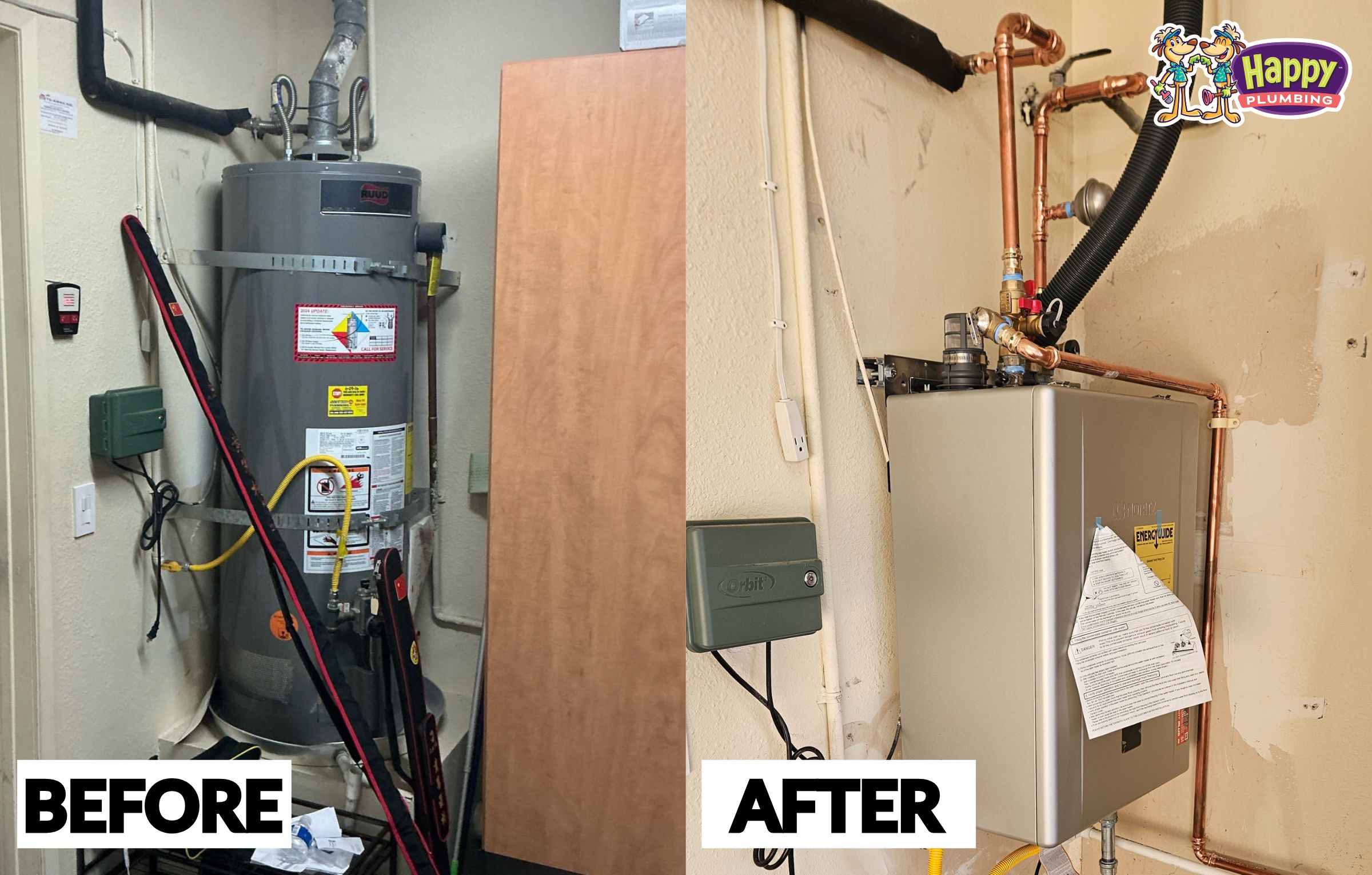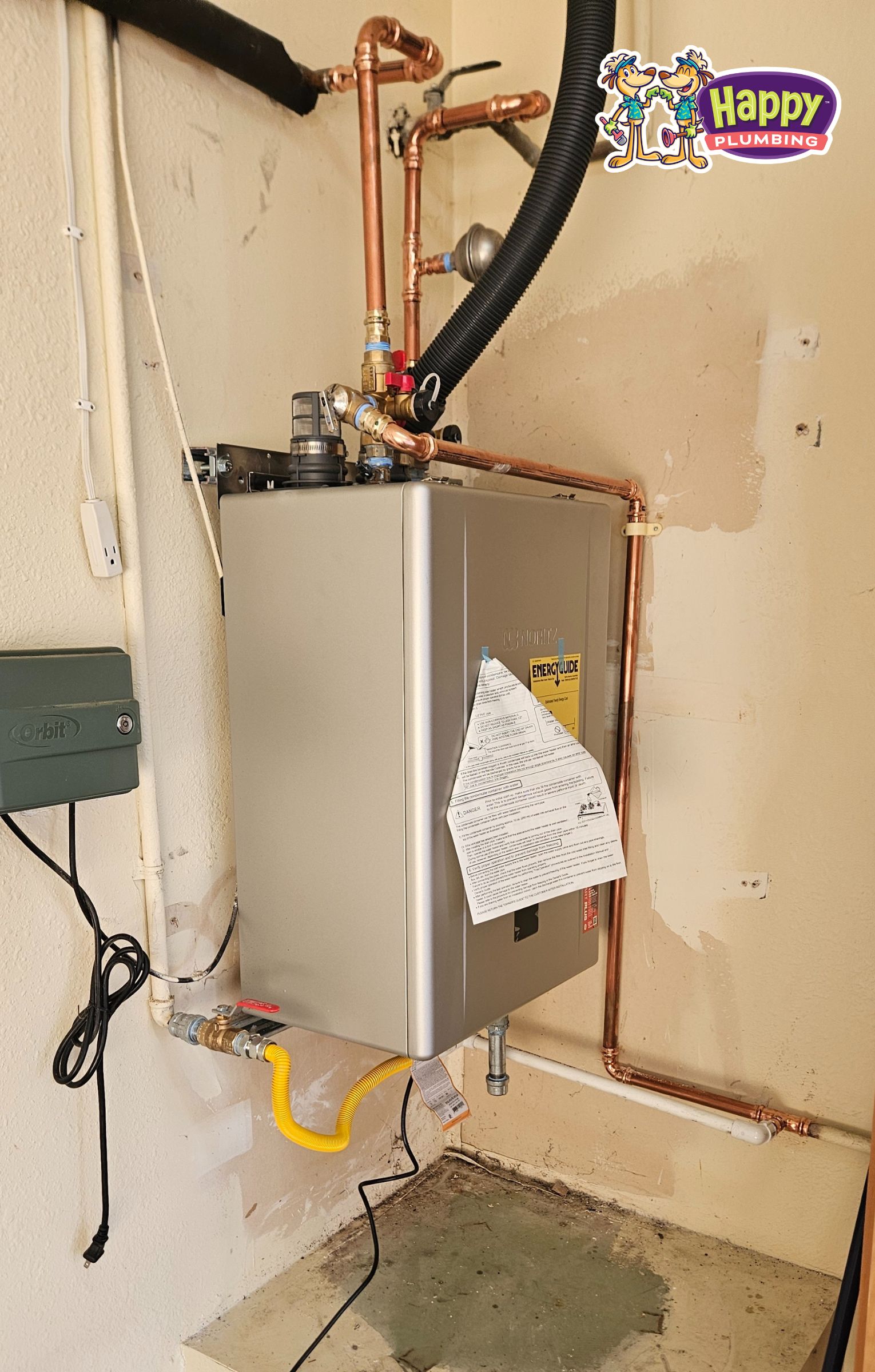 Happy Plumbing completed a full tank-to-tankless water heater upgrade for a homeowner in San Diego. Their 9-year-old tank water heater was showing signs of exterior deterioration. Concerned about potential leaks or complete failure, the client chose a proactive replacement. They also wanted to upgrade to a tankless system for its longer lifespan, better energy efficiency, and continuous hot water supply.